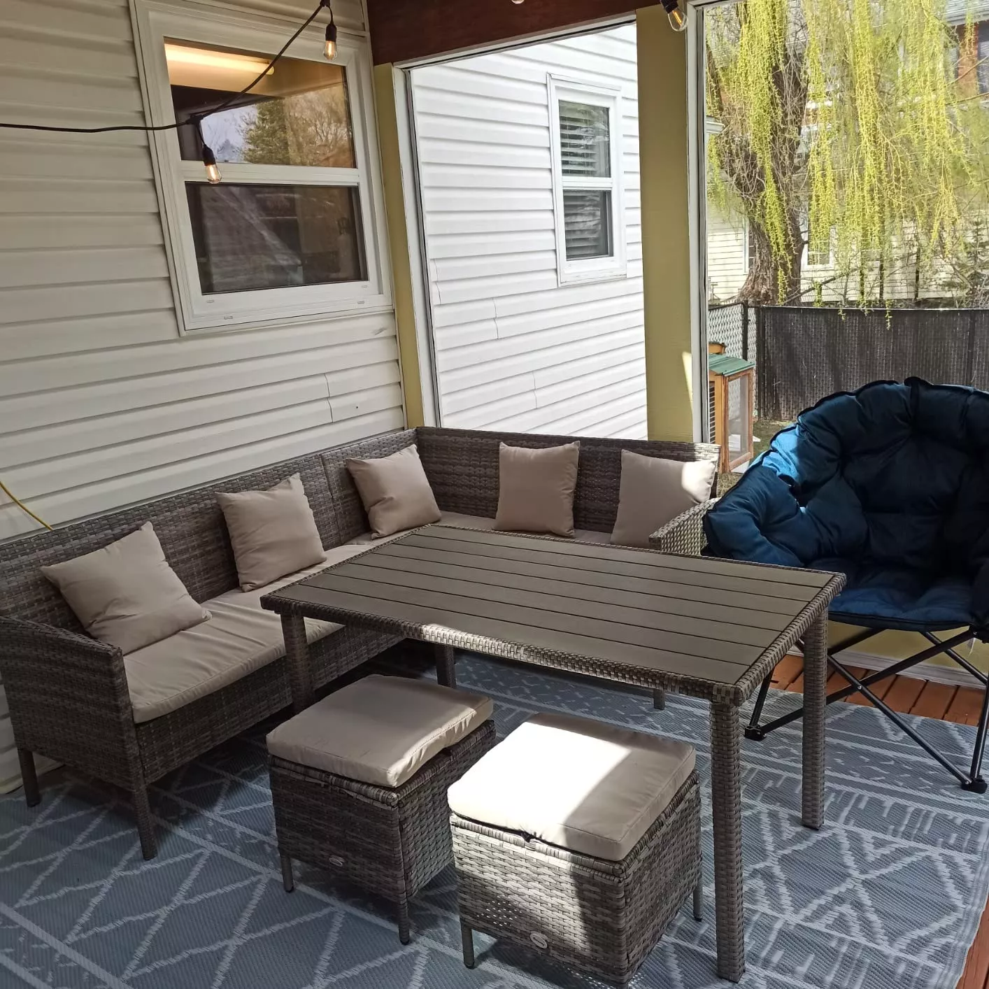 This L-shaped sectional sofa set has exceeded all expectations! From ordering to delivery and assembly – everything went smoothly without any hiccups. Once assembled (which by the way wasn’t hard), it added such an inviting ambiance to my backyard making it feel like a cozy resort getaway right at home! The cushions are plush and comfortable while the frame itself seems sturdy enough promising durability in long run. We're enjoying every moment spent outdoors now whether reading books during daytime or hosting evening chats under stars on our new favorite spot!