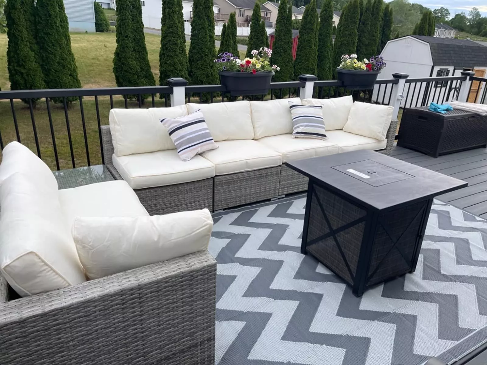 This furniture set was super easy to put together and has held up surprisingly well under all the crazy weather conditions we have in the Midwest. We’ve changed around the configuration multiple times and it always looks amazing and isn’t difficult to do. The cushions did slip, but we added Velcro and they now stay in place perfectly. The Velcro was able to adhere to the wicker with no problems, and we can remove the cushions and put them back with no issues. The cushions aren’t really thick, but they are still comfortable and we have no complaints. These are great, especially for the price!