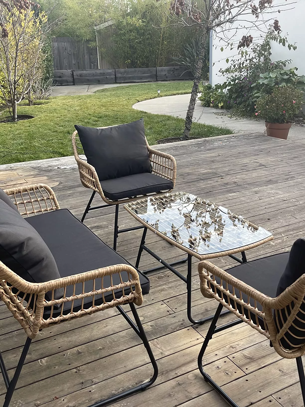 Our outdoor table and chairs set features 60% wicker and 40% steel, offering a perfect blend of style and strength. The chairs come with thick, detachable cushions, providing ample seating space for cozy parent-child time or snuggling with your pet. The cushion covers are removable, making maintenance a breeze and ensuring your furniture stays fresh and inviting all year round.