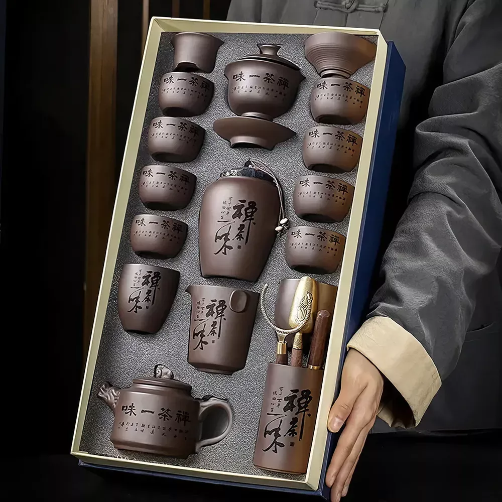 What a delightful tea set this is! I was captivated by the unique design and the fact that each piece is handcrafted. The purple sand lends an extraordinary touch, enhancing the flavor of my tea like nothing else. It's truly a luxurious addition to my collection.