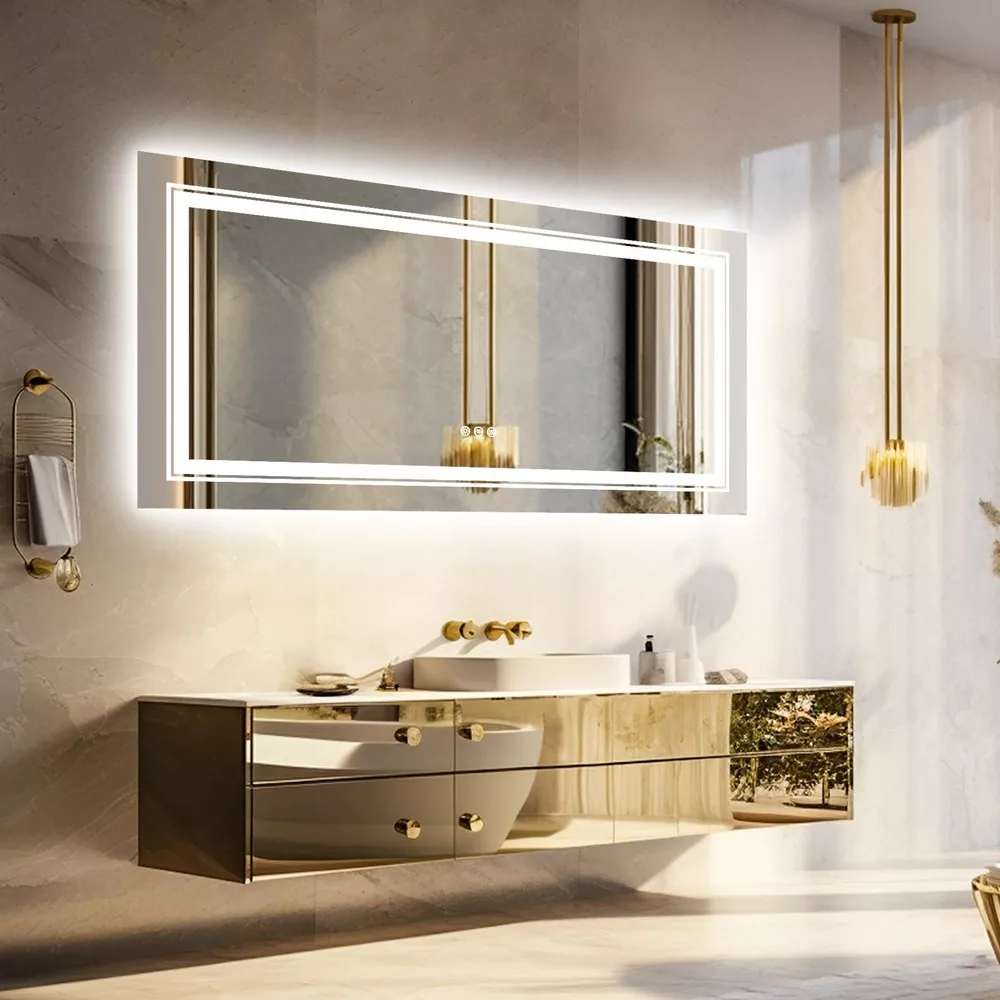 Elevate your daily routine with our LED Bathroom Mirror Large Illuminated Dimmable Vanity Mirror. Designed to bring both style and functionality to your space, this modern mirror is the perfect addition to any bathroom, salon, or makeup room. Experience flawless lighting with both front and backlit illumination, ensuring you never miss a detail while applying makeup, shaving, or grooming.