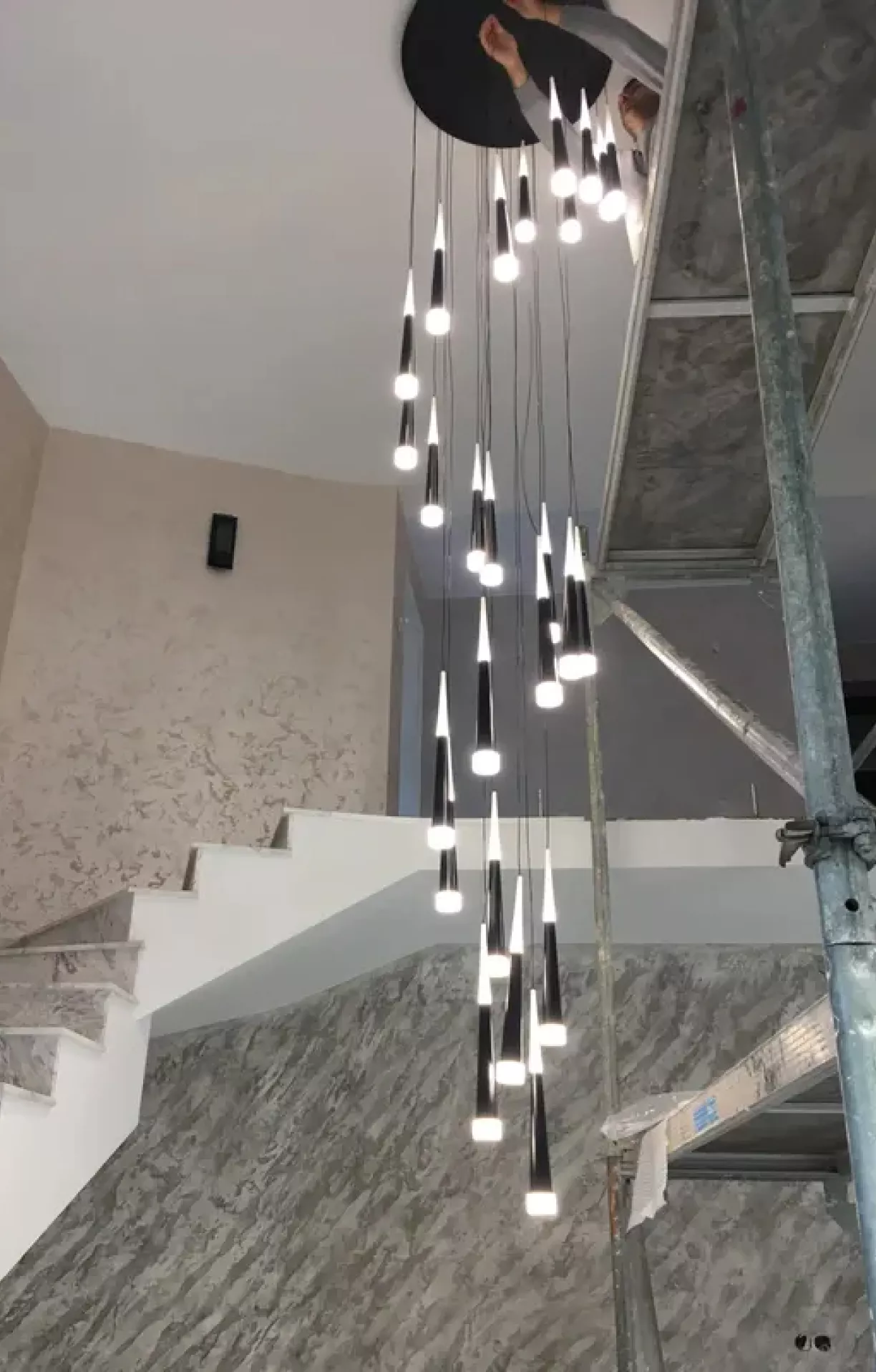 Our Modern Staircase Chandelier is a testament to the fusion of art and technology. It comes with a LED chip light source, ensuring energy efficiency and long-lasting brightness. With the capability to customize the shape and size of the chassis, the length of the hanging wire, and the number of lamp caps, this fixture is versatile to fit your specific design needs. The sturdy iron and aluminum construction, combined with a painted finish, offers durability while adding a touch of sophistication to any setting.