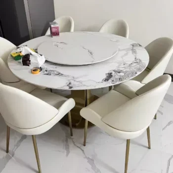 This table shines not only in its fundamental features but also in its ability to enhance the moments that matter. Best used for both daily meals and festive occasions, it turns every gathering into a luxurious banquet. The combination of practicality with the turntable and the unparalleled elegance of the gold stainless steel frame and marble top makes this dining table a unique centerpiece for your home.