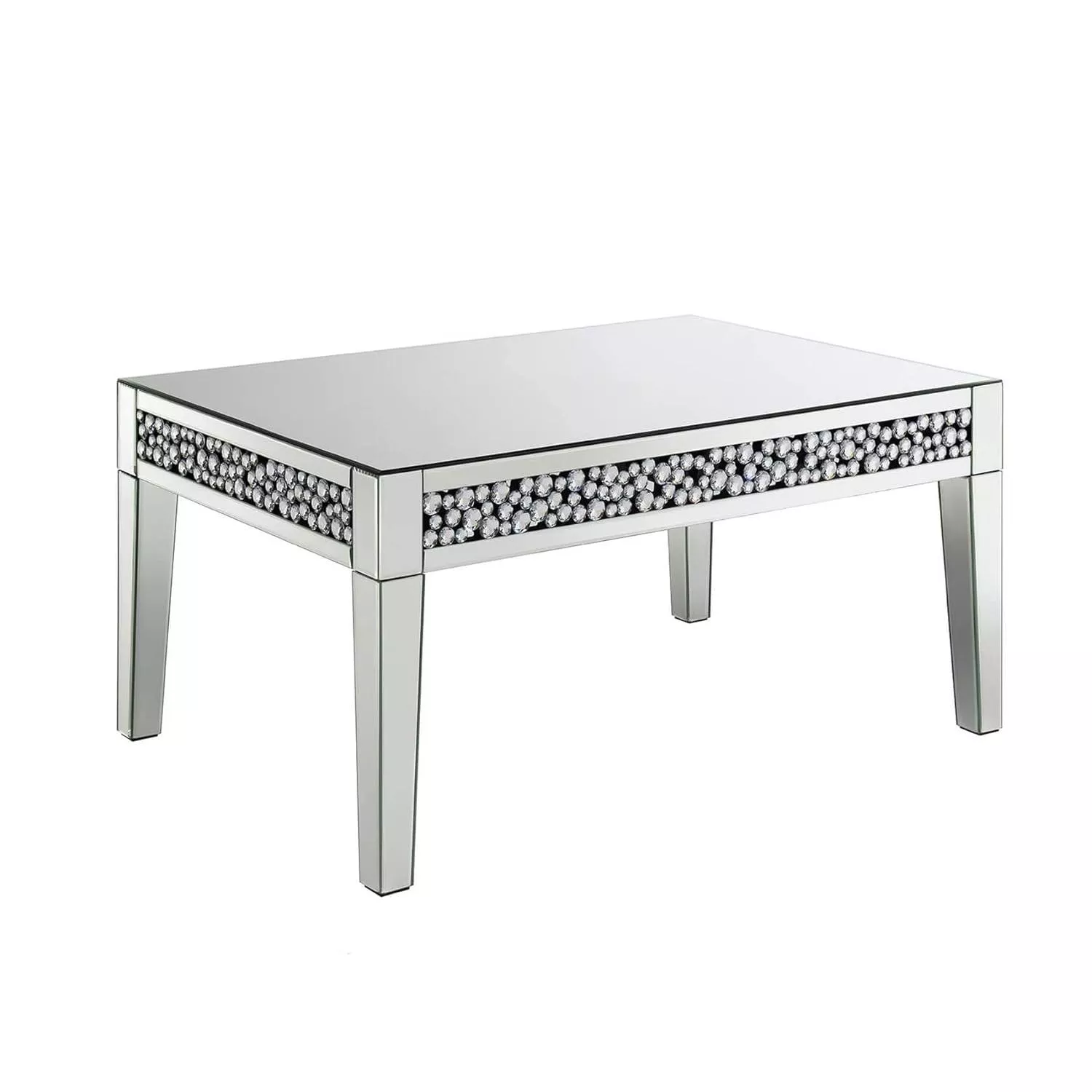 When I first laid my eyes on this coffee table, I knew that it was exactly what my living room needed. The rectangular design fits in perfectly with the rest of our furniture and creates a sense of balance in the room What really caught my attention though were the crystal inlays - they are simply stunning! They catch the light beautifully and add a touch of glamour to an otherwise simple piece. Plus, it's not just about looks; this table is also highly functional. It provides ample space for us to keep our magazines, remotes and other knick-knacks neatly organized while keeping them within easy reach.