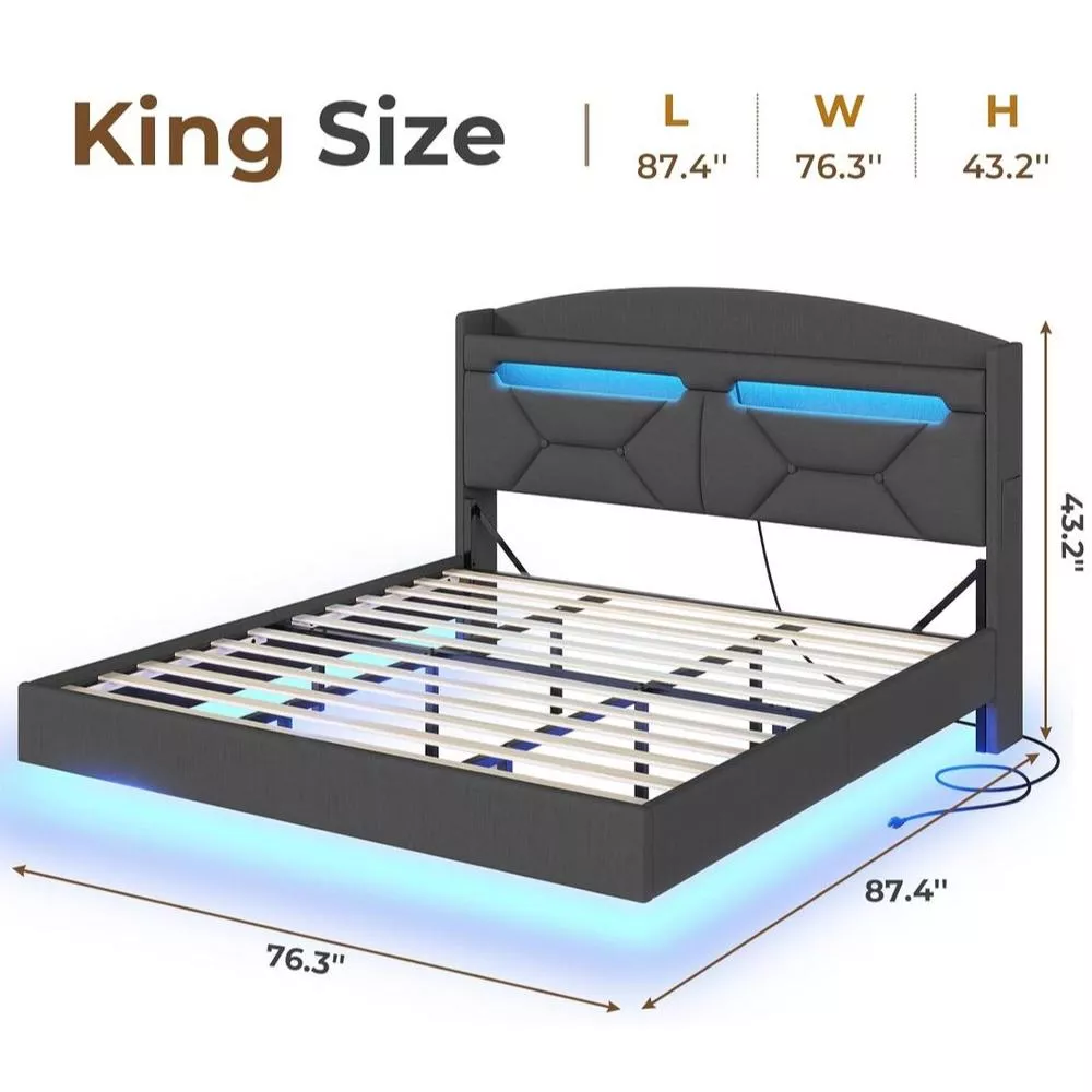 Modern Floating King Bed Frame with RGB LED Lights & Storage Headboard
