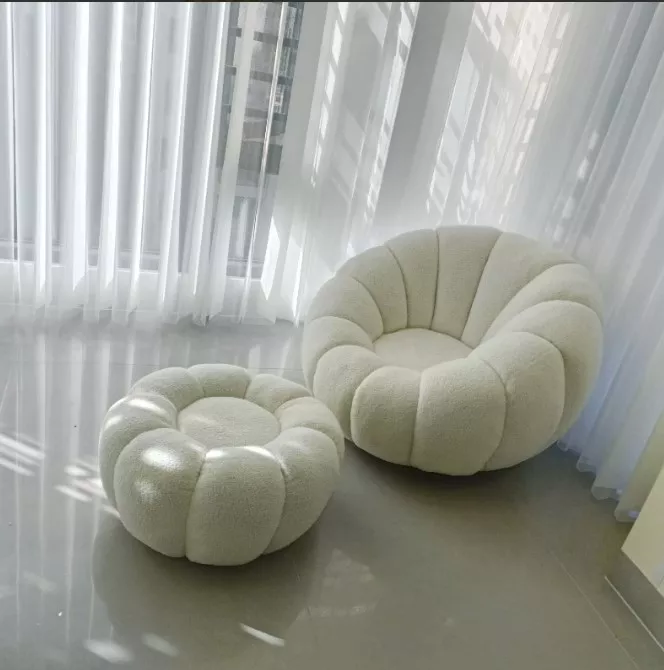 Introducing our Modern Minimalist White Velvet Lazy Sofa, a perfect blend of style and comfort for your living space. Designed to add a touch of elegance and coziness to any room, this chair is not just a piece of furniture, but a statement of modern living. Its unique pumpkin shape and plush lamb cashmere fabric invite you to relax and unwind in its welcoming embrace.