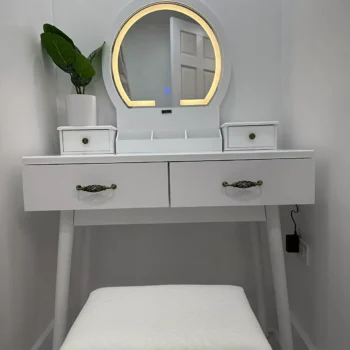 Whether you’re getting ready for the day or need a practical yet stylish space to work, our Modern Vanity Set with 3-Color Lighted Mirror and Spacious Drawers is your perfect solution. Transform your routine with elegance and efficiency. Add to cart now and elevate your daily preparations!