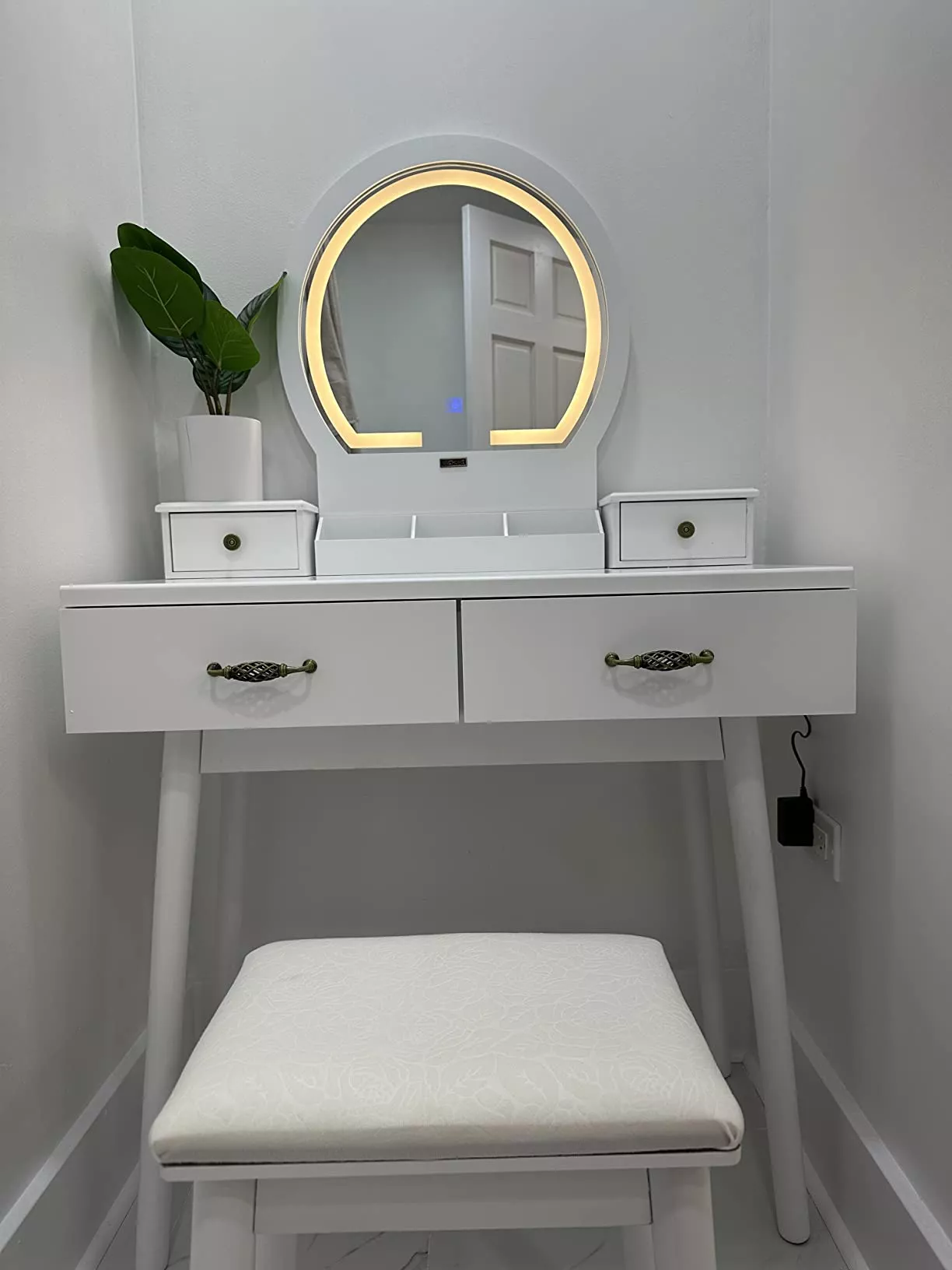 Well, let me tell you something. This vanity set? It's a total game changer. I mean it, folks! The first thing that caught my eye and made my heart skip a beat was the lighted mirror. Now, we're not talking about ordinary mirror here. Nah, this one comes with color options - yes you heard right! Imagine getting ready in the morning orpping for a night out and having the perfect lighting to do your makeup no matter what time of day is! No more squing in dim light trying to see if your foundation matches your neck or wondering if you've blended your eyeshadow enough. No sirree! With this bad boy, every little detail is illuminated so there's no room for error. And trust me when I say it has totally transformed my makeup routine! 💄💋 Before I got this vanity set, doing my makeup felt like such a chore but now? It feels like an indulgence; almost therapeutic even! Each time I sit down at it, I feel like a Hollywood starlet getting ready for her close up. And those color options on the mirror are just icing on the cake. Whether you want warm tones to recreate golden hour vibes or cool tones for that soft daylight look – they've got 'em all covered! So yeah guys...this vanity set isn't just amazing - it's beyond words fabulous!