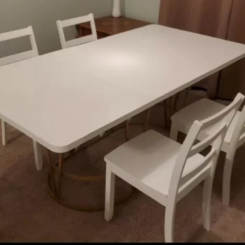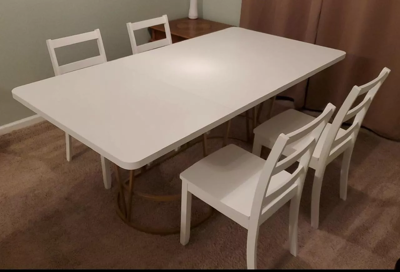 I've got to tell you, I'm head over heels for this table. gold accents on it are just something else! They really stand out and make a statement against the white background of the table. But that's not all - have you seen that marble? Oh my goodness, it is simply stunning. It gives off this vibe of elegance and sophistication that I can't get enough of. You know how some things just catch your eye and you can't help but stare? That's what marble does to me every time. What makes this table even more special is how well it fits into my dining area. It slides right in as if it was always meant to be there from the start. And boy oh boy has it made a difference! My home decor game has been seriously stepped up since bringing in this beauty. Before having this table, my dining area felt incomplete somehow; now with its addition everything feels right into place - complete and perfect! All eyes are drawn towards it whenever guests come over too which adds another level of satisfaction for me knowing I chose such a standout piece for my space.