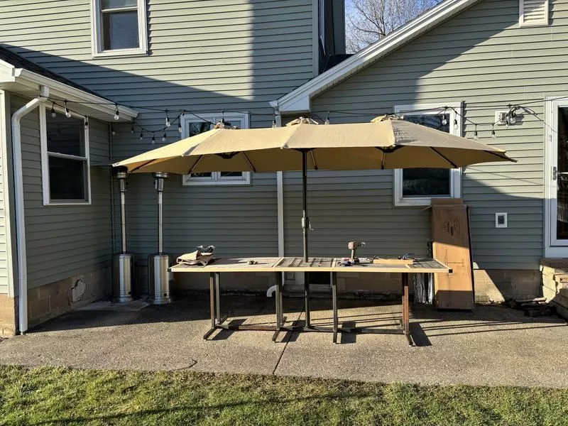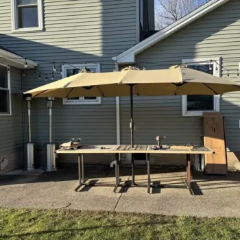 I built a large outdoor table to seat 10 people last year. This umbrella is ideal for this large area application. I was a bit skeptical at first because there were no images of it in the closed position. I was worried that it would be way to bulky when we didn’t want the umbrella open but that is not the case. I’m rather impressed on how compact the mechanism is. The lights are a nice feature and I really like the design/placement of the switch. I also wasn’t expecting it, but it came with a really nice storage bag for the off season. One thing to note, the post that goes through your table must be a 2” hole. When I received my umbrella one of the plastic parts for the base was cracked. This would have normally lead to a lower number of stars but the customer service was fantastic and sent a new part out immediately. My only real criticism of this product is that the crank mechanism feels weak. I mean to say that it feels like it is the exact same one used to open smaller umbrellas. Each time I crank it up I think to myself, is this going to break? It does have a nice pin to hold the weight when it’s up so the mechanism isn’t holding all the weight all the time, but I am 6’ tall and my wife who is 5’4” can not quite reach it.