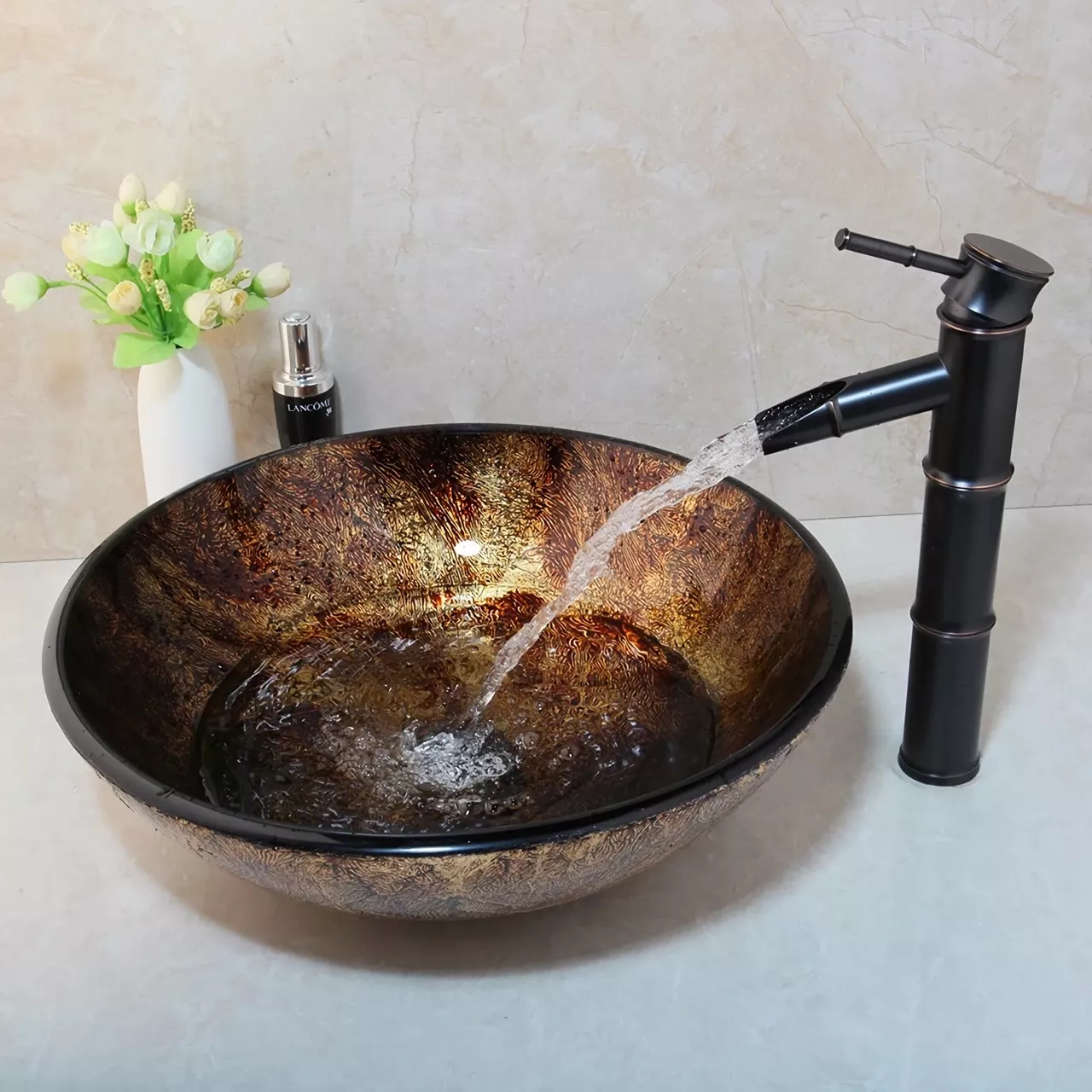 Ceramic Hand-Painted Glass Basin with Brass Set